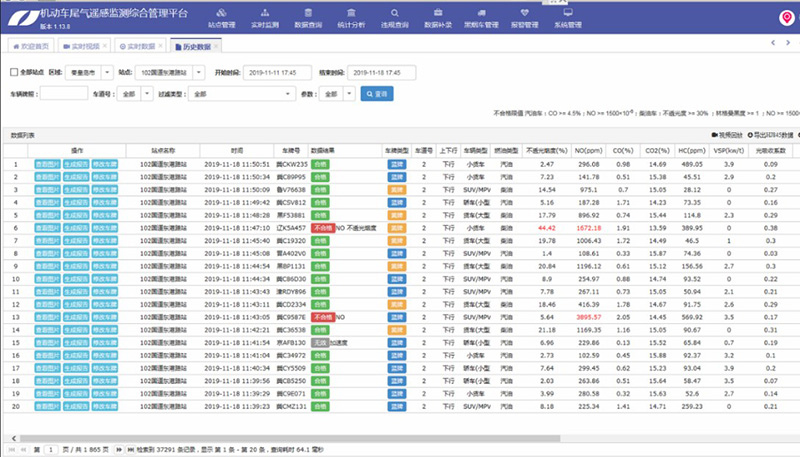 尾氣遙感檢測(cè)平臺(tái)實(shí)現(xiàn)了對(duì)機(jī)動(dòng)車尾氣數(shù)據(jù)的采集、管理維護(hù)功能??梢詫?shí)時(shí)查詢固定式站點(diǎn)監(jiān)測(cè)數(shù)據(jù)及移動(dòng)式站點(diǎn)監(jiān)測(cè)數(shù)據(jù)。所監(jiān)測(cè)的數(shù)據(jù)信息涵蓋了機(jī)動(dòng)車尾氣檢測(cè)參數(shù)值、氣象參數(shù)數(shù)據(jù)、環(huán)境空氣質(zhì)量數(shù)據(jù)、黑煙車數(shù)據(jù)等。同時(shí)結(jié)合環(huán)境空氣質(zhì)量數(shù)據(jù)與尾氣檢測(cè)數(shù)據(jù)進(jìn)行統(tǒng)計(jì)分析,并與交管局、車管所進(jìn)行數(shù)據(jù)庫對(duì)接。形成了實(shí)時(shí)查詢和匹配車輛基本信息于一體的數(shù)據(jù)檢測(cè)、統(tǒng)計(jì)、分析系統(tǒng)。