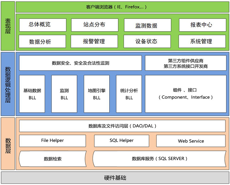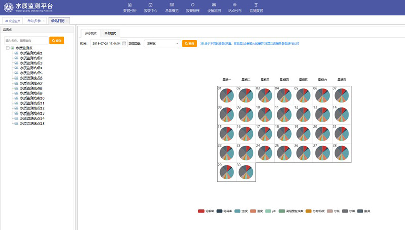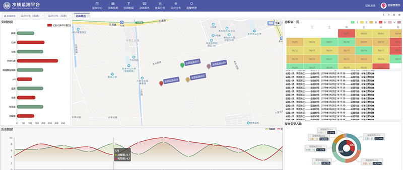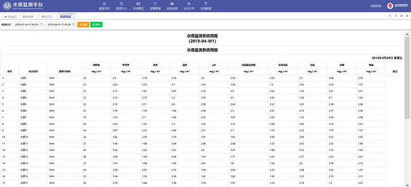 平臺采用B/S結(jié)構(gòu),實現(xiàn)基于GIS的面向水質(zhì)在線監(jiān)控系統(tǒng),能夠及時掌控各重點水質(zhì)監(jiān)測點位水溫、pH、溶解氧、電導(dǎo)率、濁度、高錳酸鹽指數(shù)、總有機碳(TOC)、氨氮數(shù)據(jù)狀況。系統(tǒng)的主要功能模塊包括:站點分布、監(jiān)測數(shù)據(jù)、總體概覽、報表管理、數(shù)據(jù)分析、排放分析、報警管理和系統(tǒng)管理。