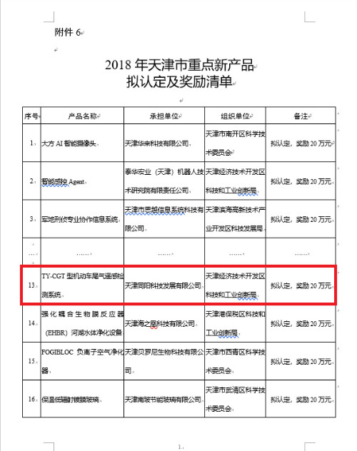 同陽科技榮獲2018年“天津市重點(diǎn)新產(chǎn)品”稱號(hào)