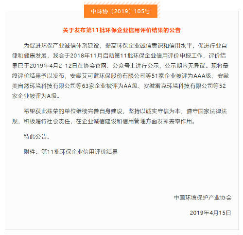 更新時間: 點擊:16478 所屬欄目:公司新聞 Update Time: Hits:16478 Belong Column:News近日,中國環(huán)境保護產(chǎn)業(yè)協(xié)會公示了“第11批中國環(huán)境保護產(chǎn)業(yè)行業(yè)企業(yè)信用等級評價結(jié)果”,天津同陽科技發(fā)展有限公司榮獲中國環(huán)保企業(yè)“AAA級信用企業(yè)”稱號。