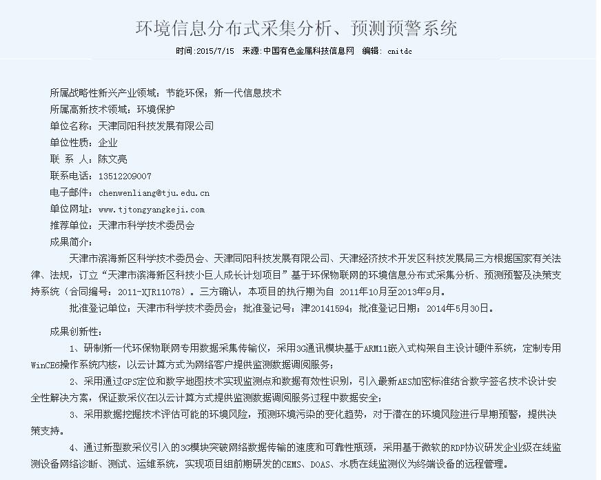 同陽科技獲得天津市濱海新區(qū)科學(xué)技術(shù)進(jìn)步獎 更新時間:2015-07-15 點(diǎn)擊:23861 所屬欄目:公司新聞 Update Time:2015-07-15 Hits:23861 Belong Column:News 天津同陽科技申報的“環(huán)境信息分布式采集分析、預(yù)測預(yù)警系統(tǒng)”項(xiàng)目,獲得天津市濱海新區(qū)科學(xué)技術(shù)進(jìn)步三等獎。