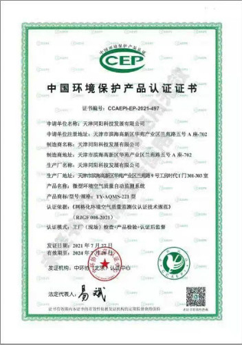 2021年5月,中環(huán)協(xié)(北京)認(rèn)證中心實(shí)施了新版認(rèn)證技術(shù)規(guī)范——《網(wǎng)格化環(huán)境空氣質(zhì)量監(jiān)測(cè)儀認(rèn)證技術(shù)規(guī)范》(RJGF008-2021),天津同陽科技發(fā)展有限公司的微型環(huán)境空氣質(zhì)量自動(dòng)監(jiān)測(cè)系統(tǒng)在經(jīng)過“產(chǎn)品檢驗(yàn)+工廠(現(xiàn)場(chǎng))條件審查”后,順利通過中國環(huán)境保護(hù)產(chǎn)品認(rèn)證工作,獲得了由中國環(huán)境保護(hù)產(chǎn)業(yè)協(xié)會(huì)頒發(fā)的CCEP中國環(huán)境保護(hù)產(chǎn)品認(rèn)證證書(證書編號(hào):CCAEPI-EP-2021-497)。同陽科技是首批通過新版認(rèn)證技術(shù)規(guī)范并取得CCEP證書的企業(yè)。