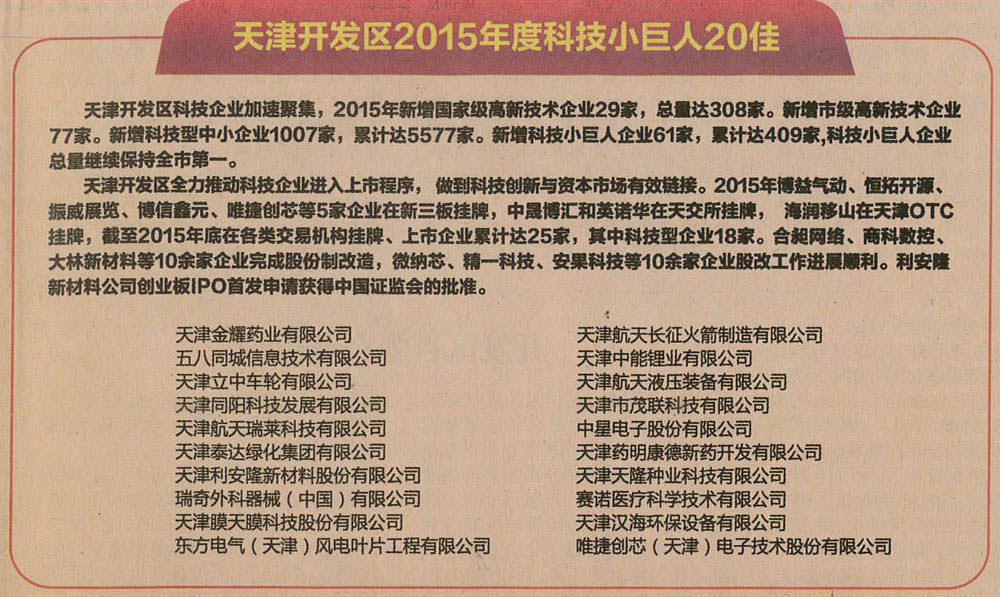 天津同陽科技被評為開發(fā)區(qū)2015年度科技小巨人20佳